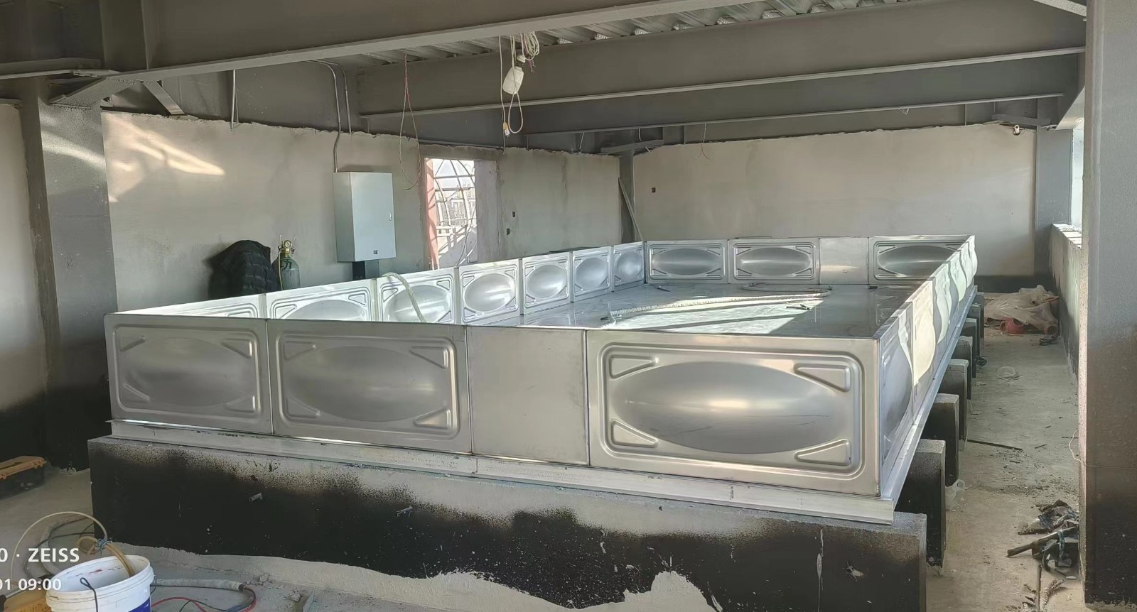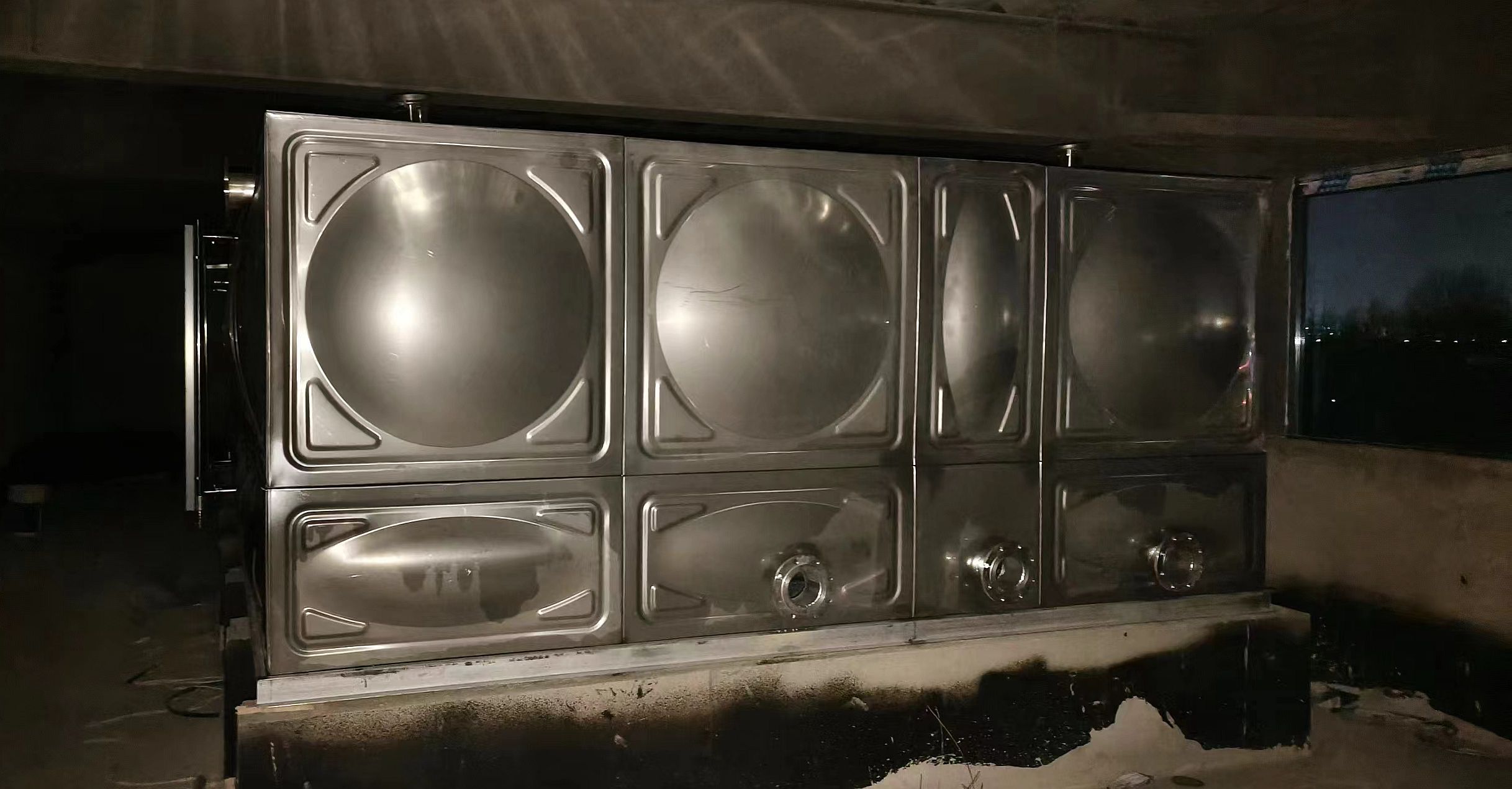 我司承接的河北省河北省衡水市武強縣汽車站樓頂項目已安裝試水完畢,此水箱用作為消防水箱使用。不銹鋼全焊接水箱為現場組合方式,強度高、密封性好,防止水質二次污染,永不滲漏,重量輕,是普通鋼板水箱的二分之一,價格合理,外觀整潔、光亮、美觀、實用等特點。